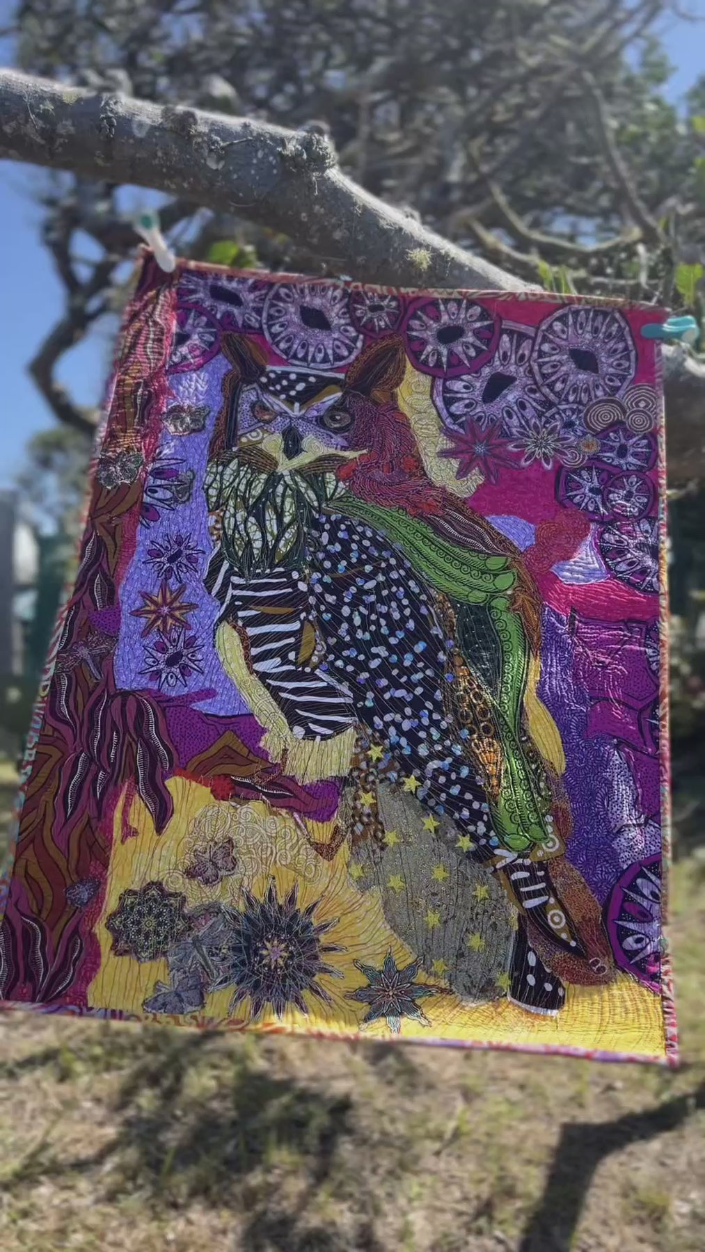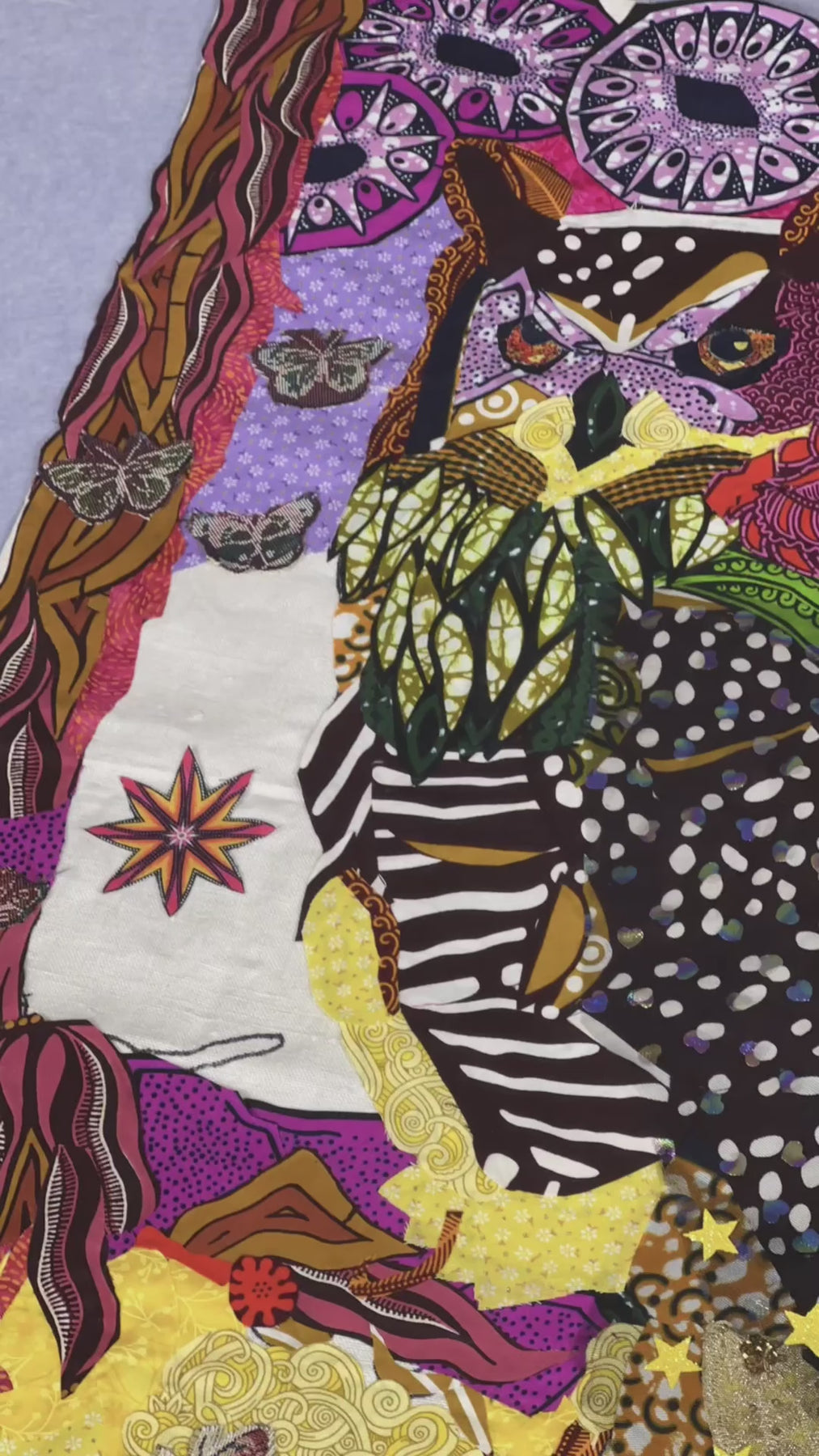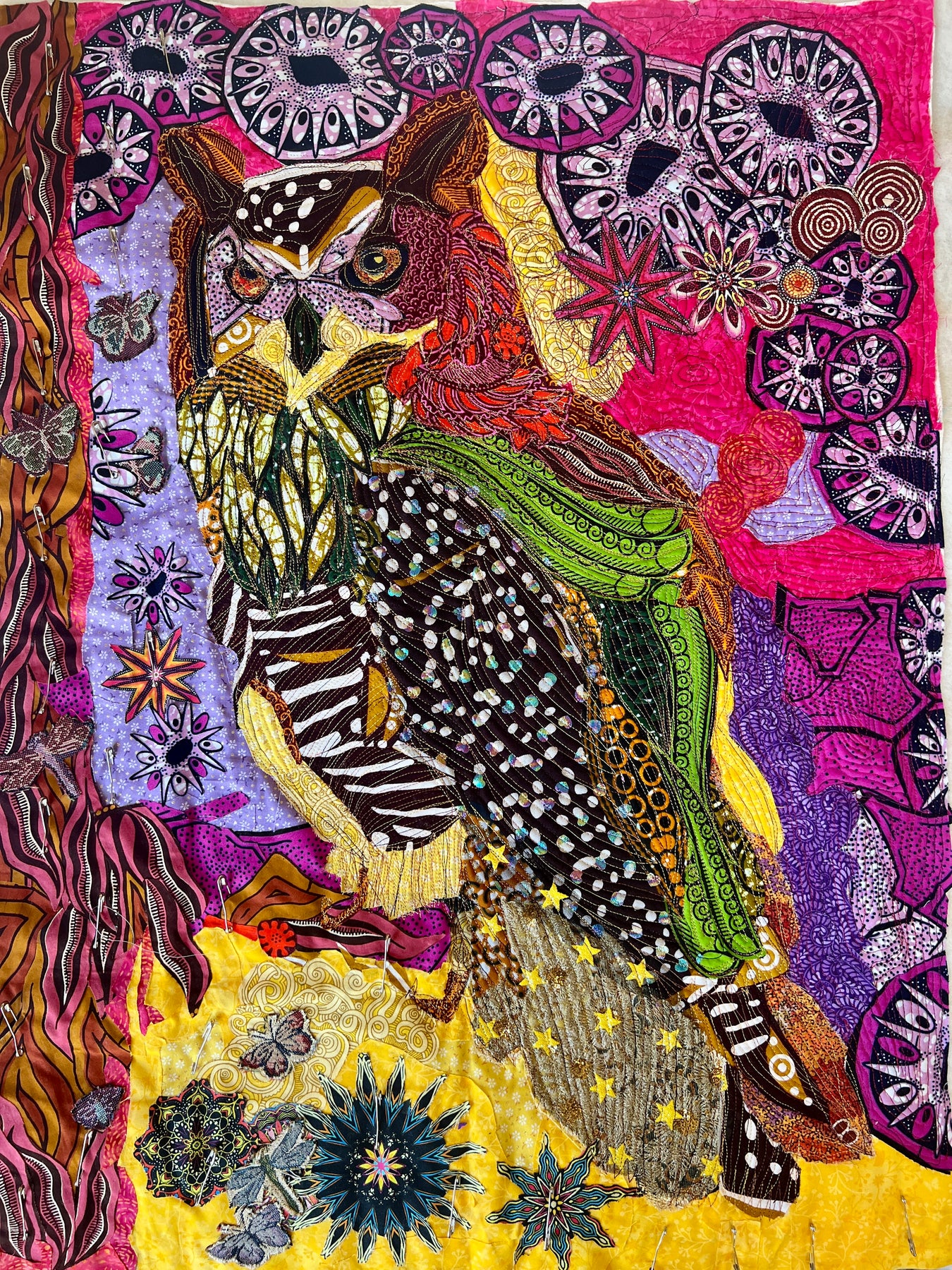 This magical owl definitely symbolizes wisdom, and connects to the spiritual realm and the subconscious. I loved creating this owl for you. He seemed to appear through my hands with very little effort and I think he is the best example of my fabric collage experiments so far.