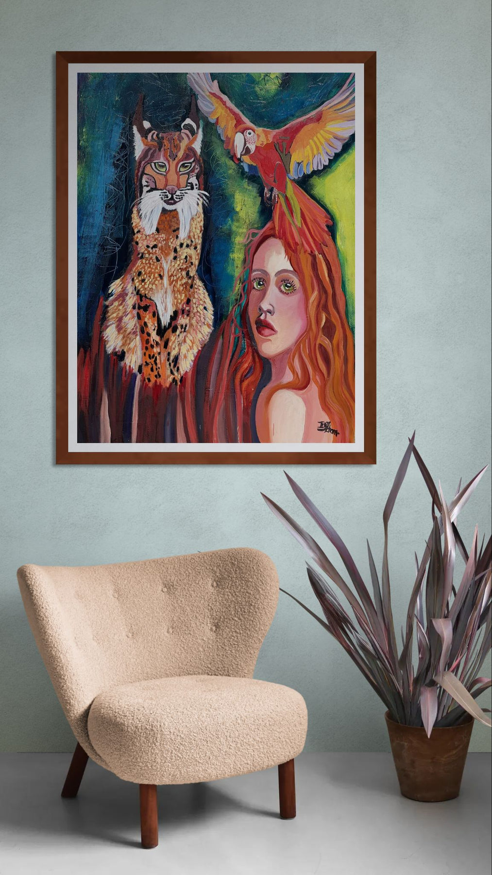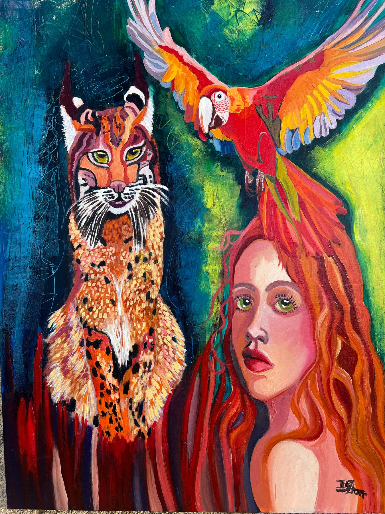 As you gaze at the young woman in my painting, imagine her as a reflection of your own journey as an artist. The vibrant colors swirling around her evoke that exhilarating feeling of creativity, while the macaw soaring above symbolizes the bold choices we all make in our artistic paths. Think back to those times when you dared to push boundaries and express your true self—can you feel the excitement of those experiences?