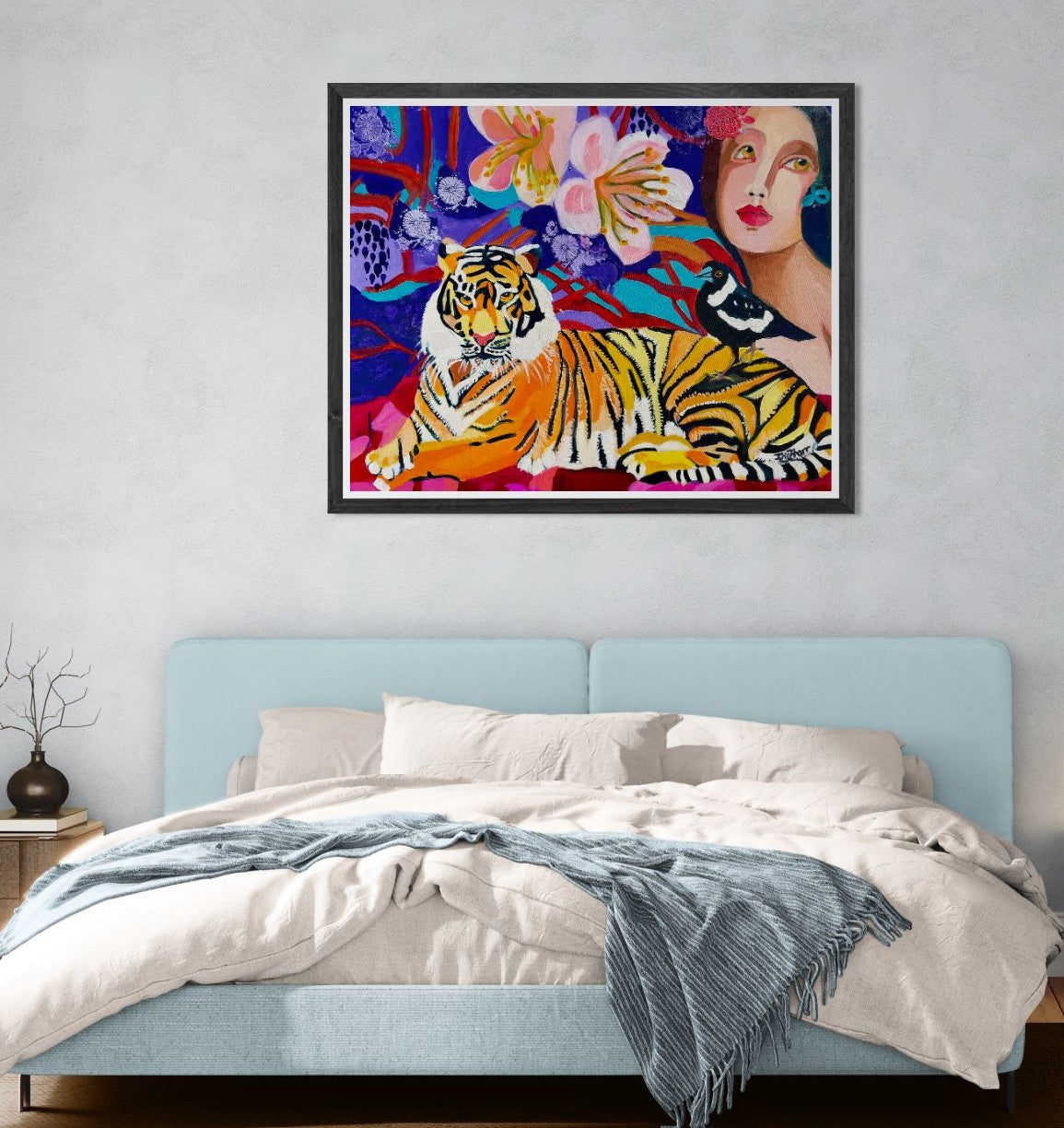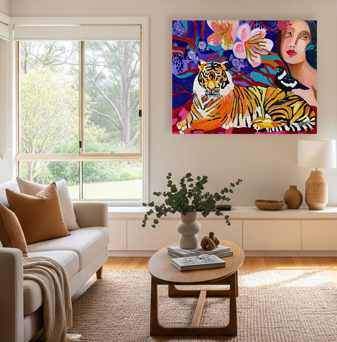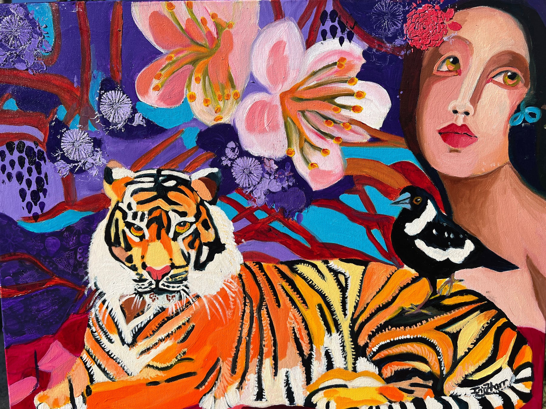 This painting was inspired by my visit to the Jacaranda Festival in Grafton. Such beautiful colours and seemed like the perfect backdrop for a tiger, a magpie and a woman dreaming of wild places. Size: 30 x 24 inches on gallery wrapped canvas. Oils and Acrylics.